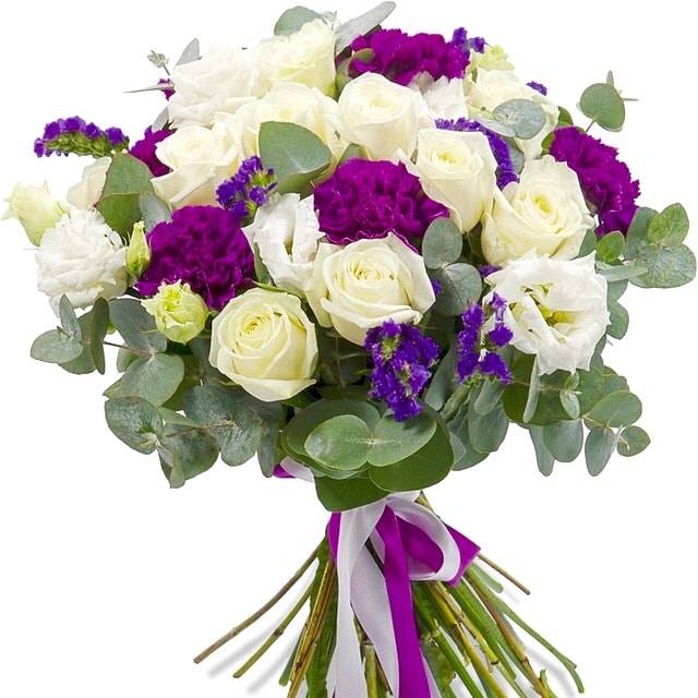 Гвоздики, входящие в состав букета, помогут вам выразить с помощью этой цветочной композиции свою увлеченность и очарование адресатом. Белые розы являются символом чистоты и невинности, а необычный цветок лизиантус придает букету особую эффектность и делает его невероятно оригинальным и необычным. К тому же, использование зелени эвкалипта придает свежести композиции, благодаря чему она выглядит еще привлекательней. Такой букет непременно поможет вам добиться прощения от дорогого человека.